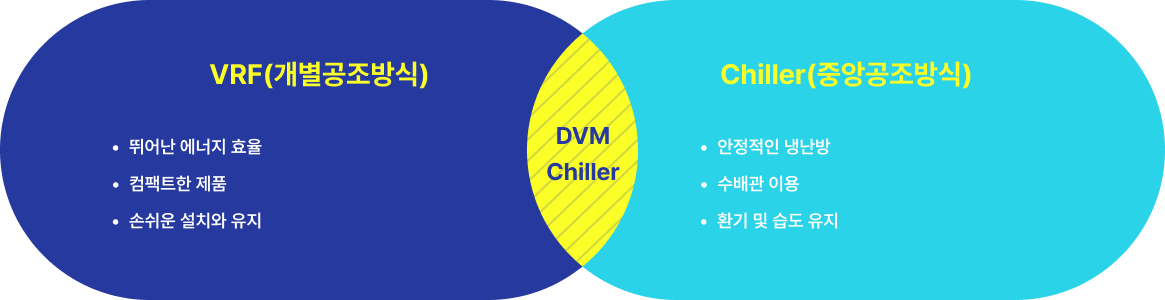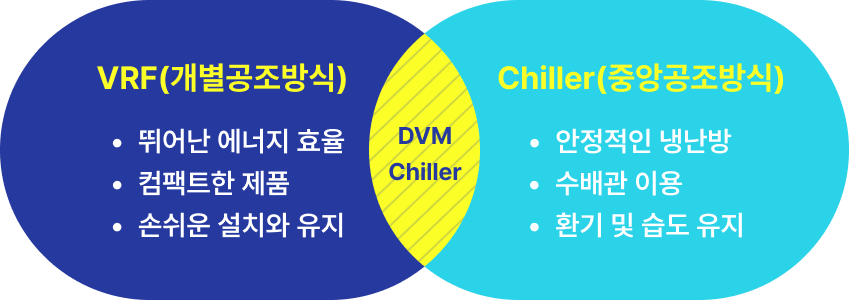 DVM Chiller는 개별공조 방식(VRF)과 중앙공조 방식(Chiller)의 장점을 결합한 공랭식 히트펌프 제품으로 최저 -10℃ 에서 최고 55℃의 다양한 출수를 생산합니다.