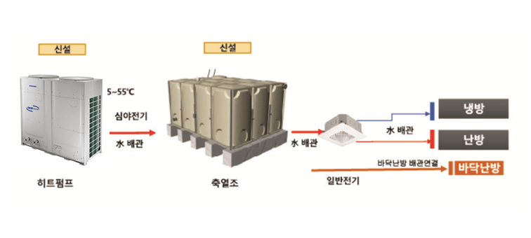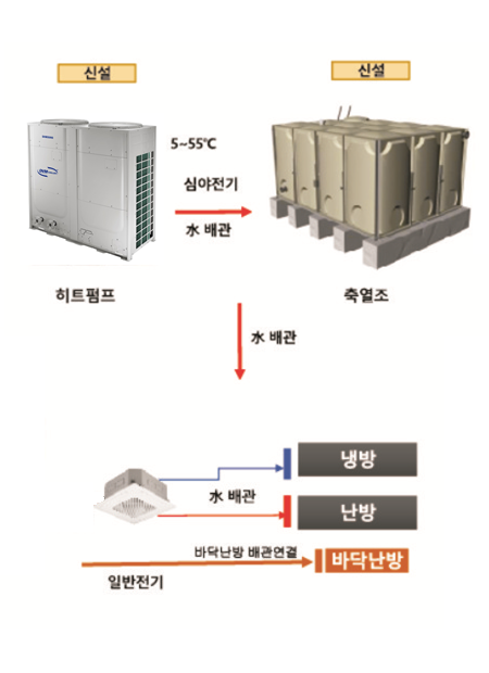 Electric Motor driven Heat Pump의 약자로 전기모터를 이용하여 압축기를 구동합니다. 냉매를 순환하여 열교환기를 통해 냉수/온수를 생산하여 축열조에 에너지를 저장하는 시스템입니다.